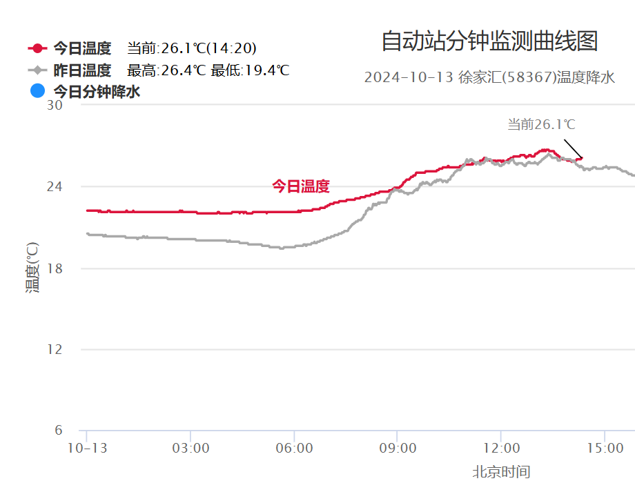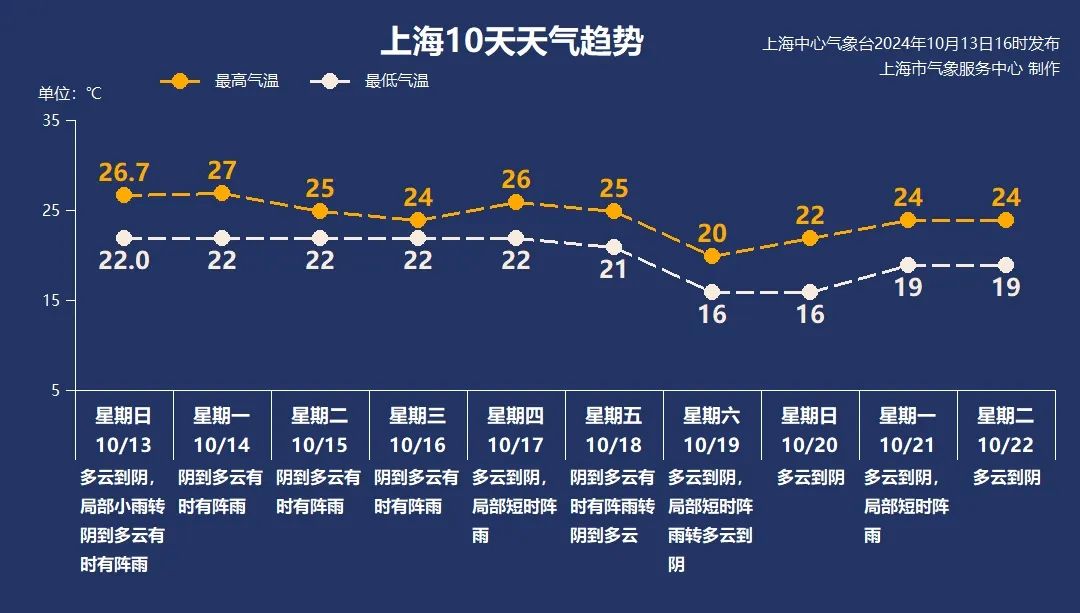 今天(10月13日),上海有很多云系,伴随着雨水。降雨主要发生在中北部地区,一般是小雨,影响有限。以城市徐家汇站为例,由于云层较厚,昼夜温差收窄,最低温度为22.0℃,最高温度为26.7℃,早晚降温不明显。申城接下来的一周经常下雨,周六气温明显下降。