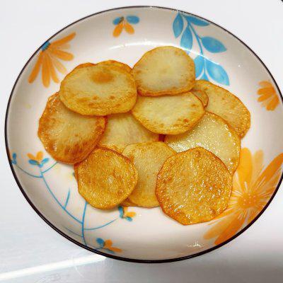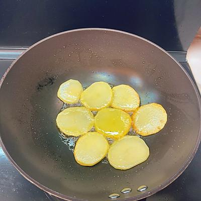 2、锅内低油,中火煎土豆片,煎至两侧金黄。