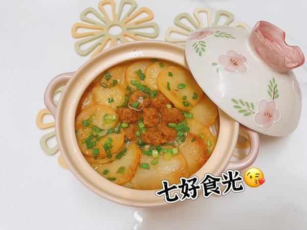 6、编码土豆片和做好的肉丸。肉丸是以前做的,当时没有拍照,再做的时候给大家发。