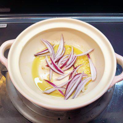 4、在砂锅里先炒蒜末,洋葱丝