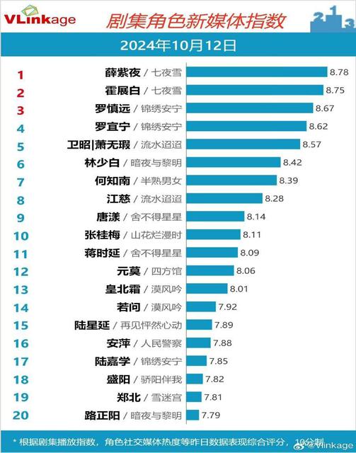VLinkage剧集角色指数:《七夜雪》角色霸榜,《锦绣》排名第二。