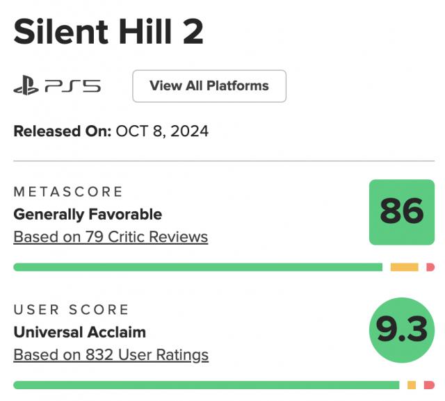 在 metacritic 上, 2024 年《寂静岭 2 重制版 》的分数有 86 分数,顾客评分冲到了 9.2 分数,算得上是高得离谱。