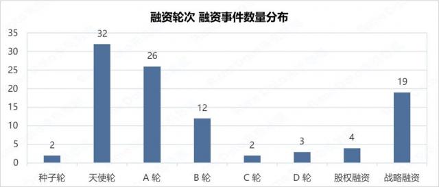 就融资轮次的分布而言,报告期内天使轮最为活跃,融资事件数量达到 32 起;A 轮子排在第二位,为 26 起;天使轮和 A 轮合计占比 58%。在融资金额方面,报告期内股权融资占比最高,达到 39.44%;其次是 D 轮换,融资金额占比 17.32%。总体而言,报告期内融资轮次金额分布较为集中。