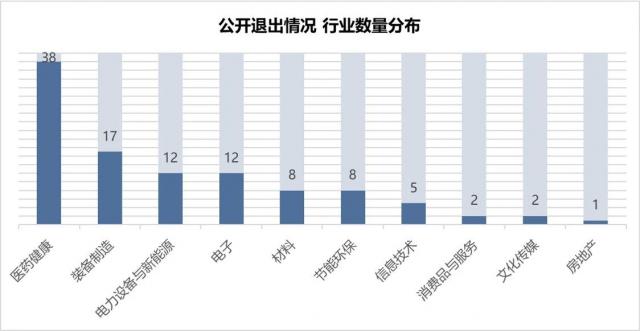 就行业分布而言,报告期内撤出案件共涉及 10 个别行业。退出案例数量最多的行业是医疗卫生,其次是设备制造、电气设备与新能源、电子并列第三,四大行业总退出案例。 79 一个,大约占案例数 75.24%。