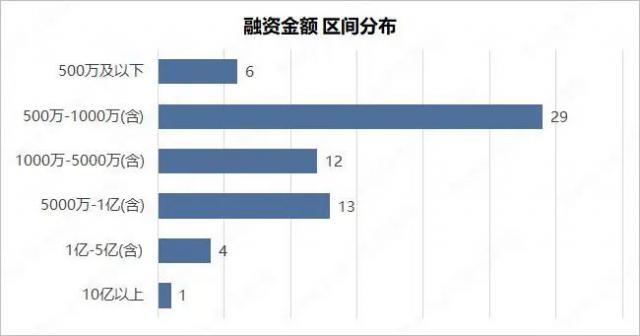 报告期内已披露的融资事件数额 65 起。融资金额区间分布结构与过去变化不大,500 融资事件发生在万万以下。 6 起;500 万 -1000 万(含 1000 万)融资事件总数 29 起;1000 万 -5000 万(含 5000 万)融资事件为 12 起;5000 万 -1 亿(含 1 十亿美元)融资事件 13 起;1-5 亿(含 5 亿)融资事件为 4 起;无 5-10 亿(含 10 十亿美元)融资事件;十 超过1亿的融资事件是 1 起。