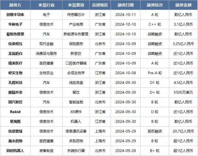 截至 2024 年 10 月 11 日 18:报告期内,融资事件共发生 100 从(不包括并购、固定增加)开始,融资总额约为 54.00 1亿元(谨慎估计)。在所有融资事件中,融资金额超过1亿元的融资事件包括 15 开始。在报告期内公开撤回案件 105 个,包括投融事件 144 家庭机构参与一级市场投资。