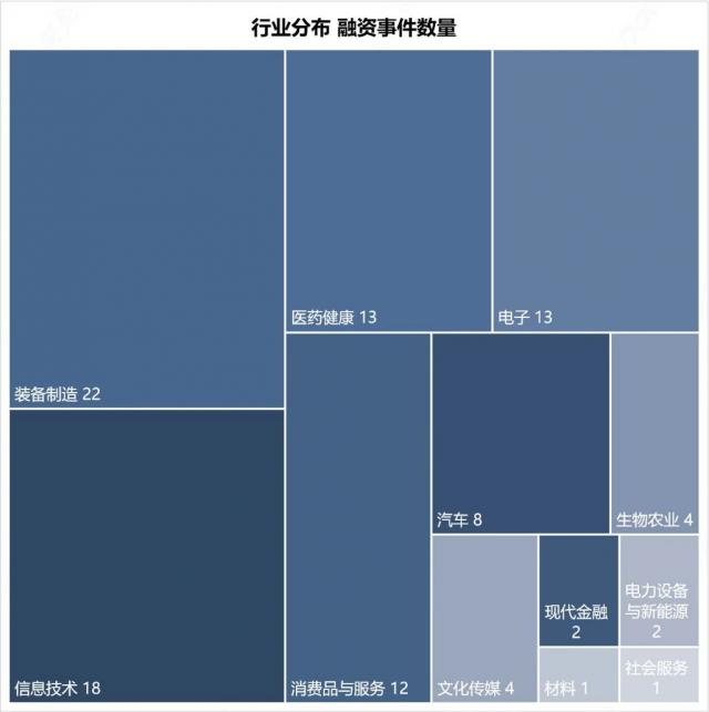 报告期内的融资事件涉及 12 根据融资事件的数量统计,前五个行业分别是设备制造、信息技术、医疗保健、电子和消费品和服务,前五个行业的融资事件总额。 78 起初,占所有融资事件总数的总和。 78.00%。就融资事件数量而言,报告期内装备制造业最为活跃,融资事件数量为 22 起床,其中机器人跑道有 10 起融资。资讯技术排名第二,融资事件数量为 18 起。医学健康排名第三,融资事件数量为 13 起。