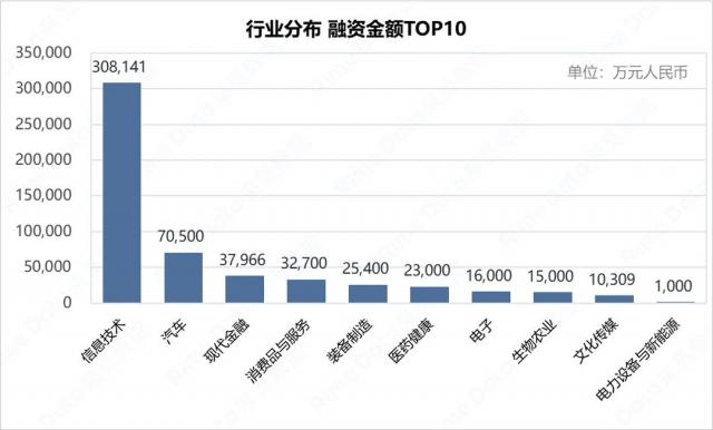 根据融资金额统计,前五个行业分别是信息技术、汽车、现代金融、消费品和服务以及设备制造,前五个行业的总融资金额。 47.47 亿元,占融资总额 87.91%。就融资金额而言,信息技术行业在报告期内居首,主要是因为信息管道。 20.7 亿元 A 轮股融资,熊猫外卖 5500 万美金 D 轮融资事件的影响。受孔辉科技技术的影响,汽车排名第二。 4.5 亿元 D1 轮融资的影响。