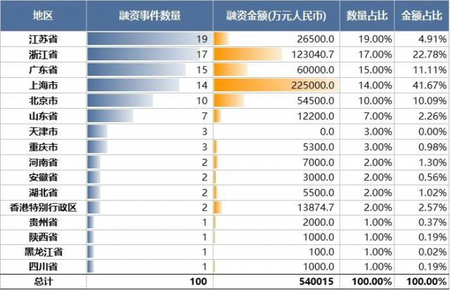 报告期内,江苏省、浙江省、广东省、上海市、北京市是融资事件数量前五的地区,前五地区总融资事件发生。 75 起初,占所有融资事件总数的总和。 75.00%。融资金额方面,前五地区为上海市、浙江省、广东省、北京市、江苏省,前五地区融资总额为 48.90 占全部融资总额的亿元 90.56%。上海市融资金额排名第一,主要是因为极值融资事件,即信息管道。 20.7 股权融资对亿元的影响。