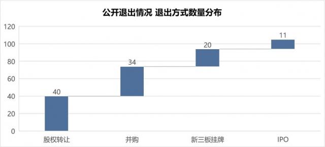 报告期内,从撤出情况来看,共有 105 一个公开撤回案例;其中,股权转让 40 个,并购 34 个,新三板上市 20 个, IPO 11 个。