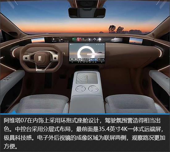 阿维塔内饰方面 07 以简约为主,环抱式驾驶舱可以带来更强的驾驶氛围,35.4 英尺 4K 集成式远端屏幕的加入也使汽车更加现代。新车内饰采用多种软质材料包裹,进一步增强了内饰的豪华感。
