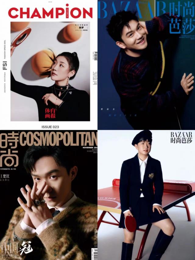 孙颖莎、王楚钦、樊振东、陈梦等国乒队登上《时尚芭莎》。《Another Men》《时尚 Cosmo》《体育画报 Champion》等。