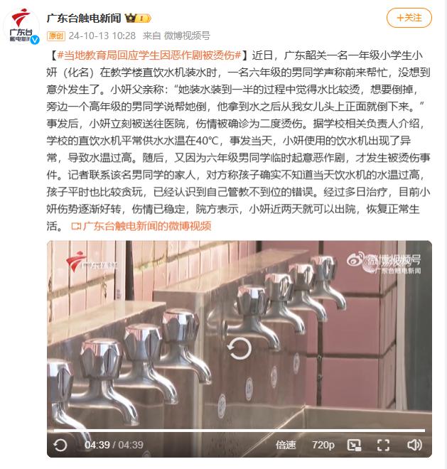 韶关市乳源瑶族自治县教育局副局冯春润告诉记者,涉案男孩对受伤儿童实施的是暂时的恶作剧,而不是故意或恶意的恶作剧。学校负责安全管理,因为涉案学校的直饮水机没有人为故障,导致水温异常,这是事件的原因之一。