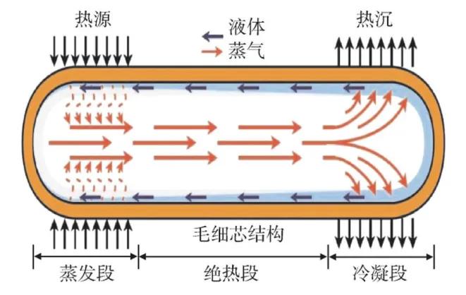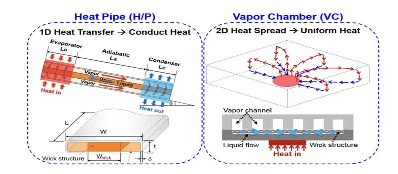- 热管:热管技术通过改变原理高效导热。热管内部包括导热液体,液体吸收热量,在热源附近挥发成气体。气体沿热管移动到冷端,释放热量,凝结成液体,然后通过毛细或重力回到热原端循环。这种循环促使热管快速传递热量。