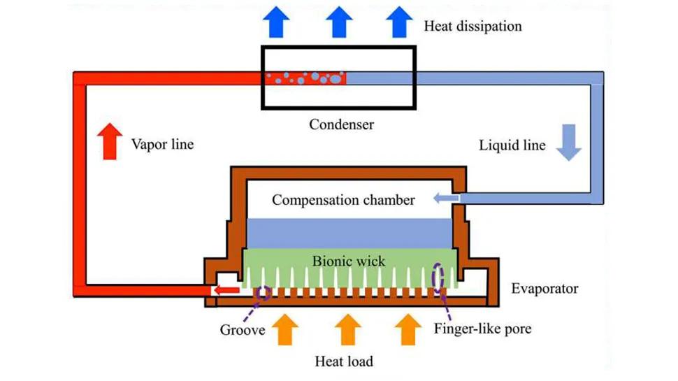 由中国科技大学叶宏教授领导的研究小组开发了一个环路热管热管的研究小组 (LHP) 突破性仿生陶瓷芯受叶孔自然蒸发过程的启发。他们的研究发表在Langmuir上,解决了传统LHP的一个关键限制。即使使用孔径均匀的芯,由于蒸汽堵塞和热阻增加,高热通量下的效率也会降低。