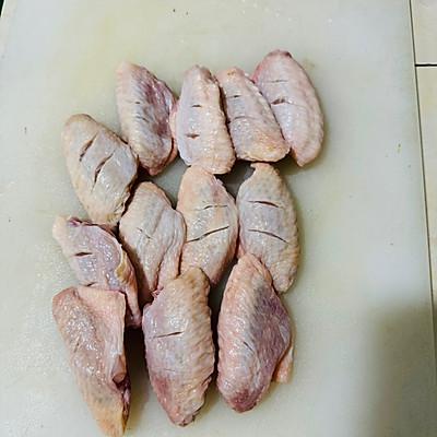 1、准备新鲜的鸡翅根,用清水洗净,用蔬菜排水篮控制水分,用刀划两次,腌制时更容易入味。~