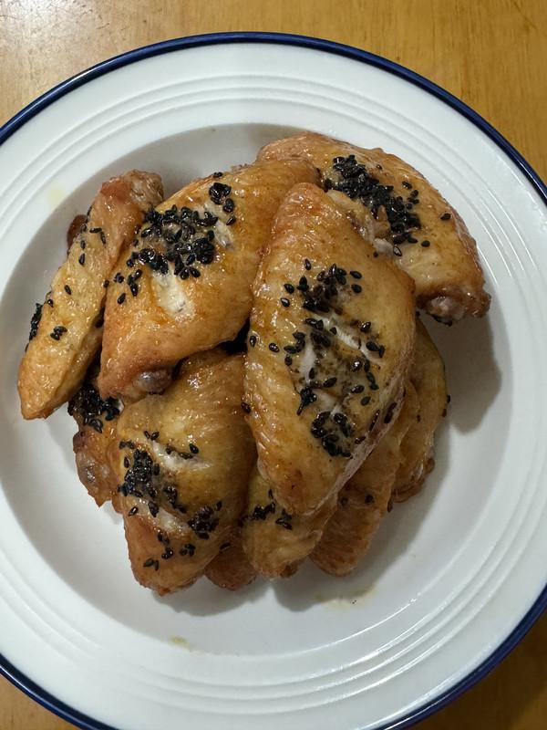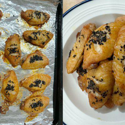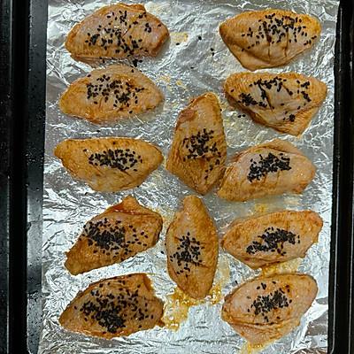 3、将腌制好的鸡翅放入烤盘中,喷上一些油,用黑芝麻装饰。~提前预热烤箱 190 度,烤 20 分钟~