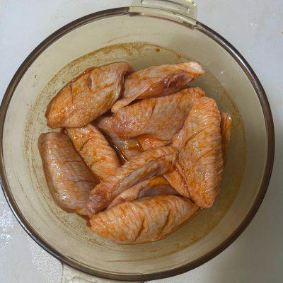 2、加入超市买的奥尔良腌翅料,超市都有卖!加入两勺蜂蜜~抓拌均匀~盖上保鲜膜!晚上我是晚上 8 从第二天早上开始腌制到第二天早上~长时间腌制更有味道~