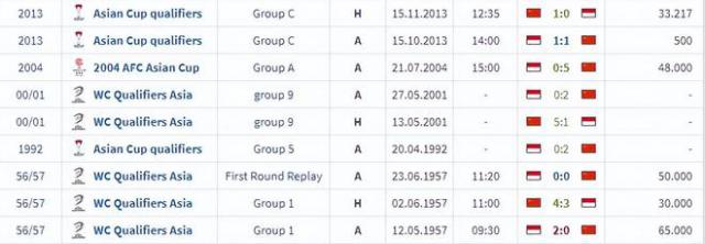 根据统计,两队过去的总共 9 第二次交手,国足获得 6 胜 2 平 1 负面,全面占优,最后一次交锋还得追溯到 2013 年度亚洲杯资格赛,当时国足主场主场 1-0 小胜利印度尼西亚武磊打进了整场比赛唯一的进球,世预赛上一次见面,就是 2001 那一年,国足主场 5-1 胜利之后,去客场 2-0 再次击败印度尼西亚,完成连杀。另外,国足还在 2004 年度亚洲杯决赛圈 5-0 对印度尼西亚进行狂扫。