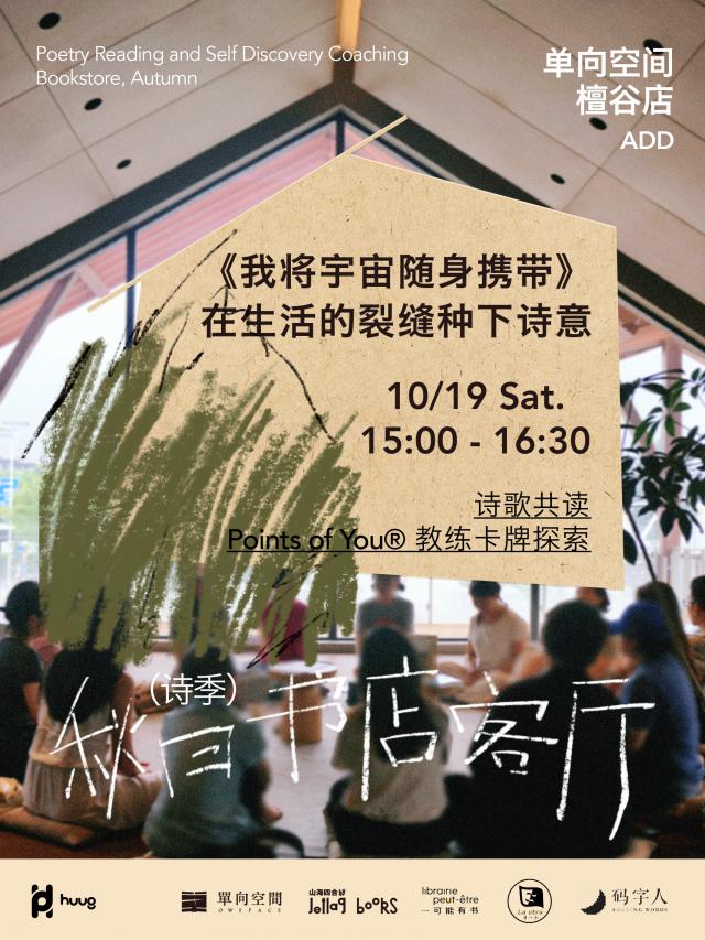 2024 年 10 月 19 日(周六)15:00-16:30,我们会在单向空间 · 檀谷店阅读佩索阿的诗歌选集《我随身携带宇宙》。 huug 在签约生活教练的带领下,感受到单纯的观察所带来的灵感和冲击。但愿我们都能得到人生的新启发和新尝试。