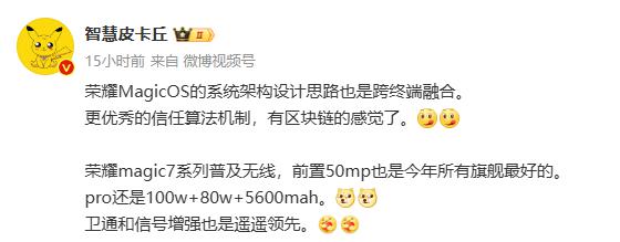 预估荣耀 Magic 7 该系列还将首发内置全新的荣耀 MagicOS 操作系统,荣耀 MagicOS 系统架构设计思路也是跨终端结合,将带来更好的信任算法机制。另外,新的荣耀 MagicOS 将重点引入 AI 技术,使用体验或者有明显的改善。