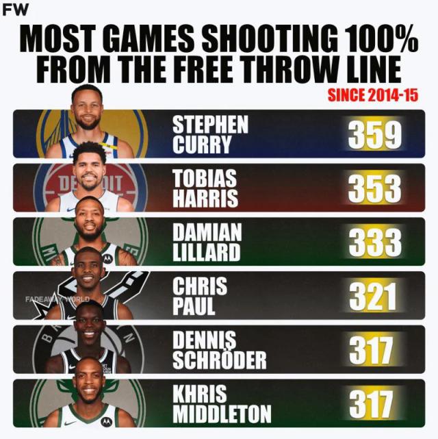 在 NBA 在这样一个崇尚速度和力量的联盟中,罚球通常被认为是最基本的技术环节,有时甚至不会受到太多人的关注。但是,真正的输赢往往取决于这些看似平凡的细节。美媒 Fadeaway World 发布了一个有趣的数据: 2014-15 赛季至今,NBA 球员们在单场比赛中 100% 在史蒂芬中,罚球命中率排名第一 · 库里以 359 次次高居榜首,下一步是托拜厄斯 · 哈里斯(353 次)、达米安 · 利拉德(333 次)、克里斯 · 保罗(321 次)、丹尼斯 · 施罗德(317 第二次)和克里斯 · 米德尔顿(317 次)。