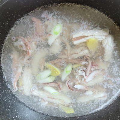 5、锅里的水放入鱿鱼、姜蒜、米酒焯水。 10 快速捞出秒钟