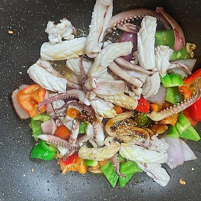 8、倒入鱿鱼开始调味,将酱油、油耗、盐大火翻炒均匀即可。