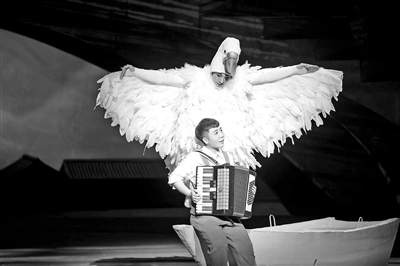 u2003u2003最有意思的就是北京京剧院武丑演员曹阳阳带领一群北戏学生表演的鹅,穿着白色羽毛,可爱极了。自艺术以来,这也是曹阳阳第一次以动物的形式在舞蹈上表演。这一角色与主角林大林互动最多,既要化身林大林渴望的父爱,又要化身他孤独时的玩伴。曹阳阳在模仿鹅行走的过程中,使用了京剧武丑的技巧。在水中救人的一段,他甚至从两米多高的桥上展开翅膀飞了下来,全新地展示了京剧的高度和空翻技巧。