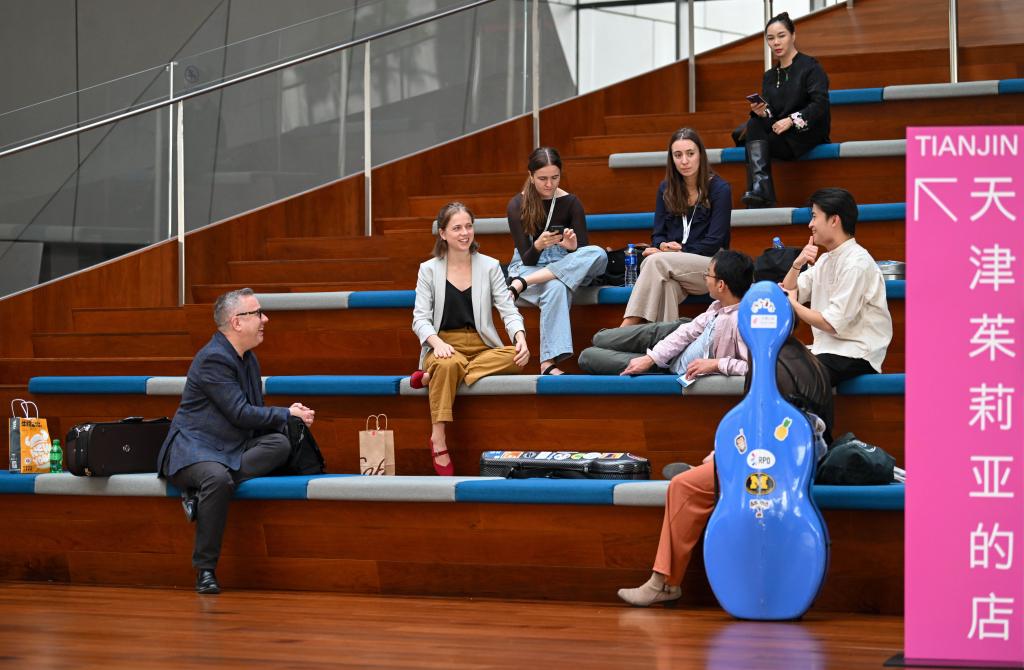 美国茱莉亚415古乐团师生u2003u2003在天津茱莉亚学院排练间隙交流(10月12日)。新华社记者 孙凡越 摄