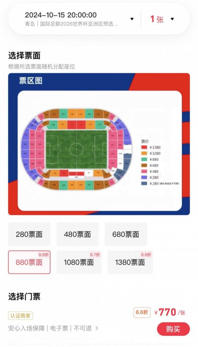 一个购票平台小程序显示,今天原定价 880 元、1080 块和 1380 第三档球票开始享受折扣,其中, 1380 元档打 8.7 另外两档打折 8.8 折。以 880 以元档为例,打折后只需要 770 元就可以买了,比原价低。 110 元。