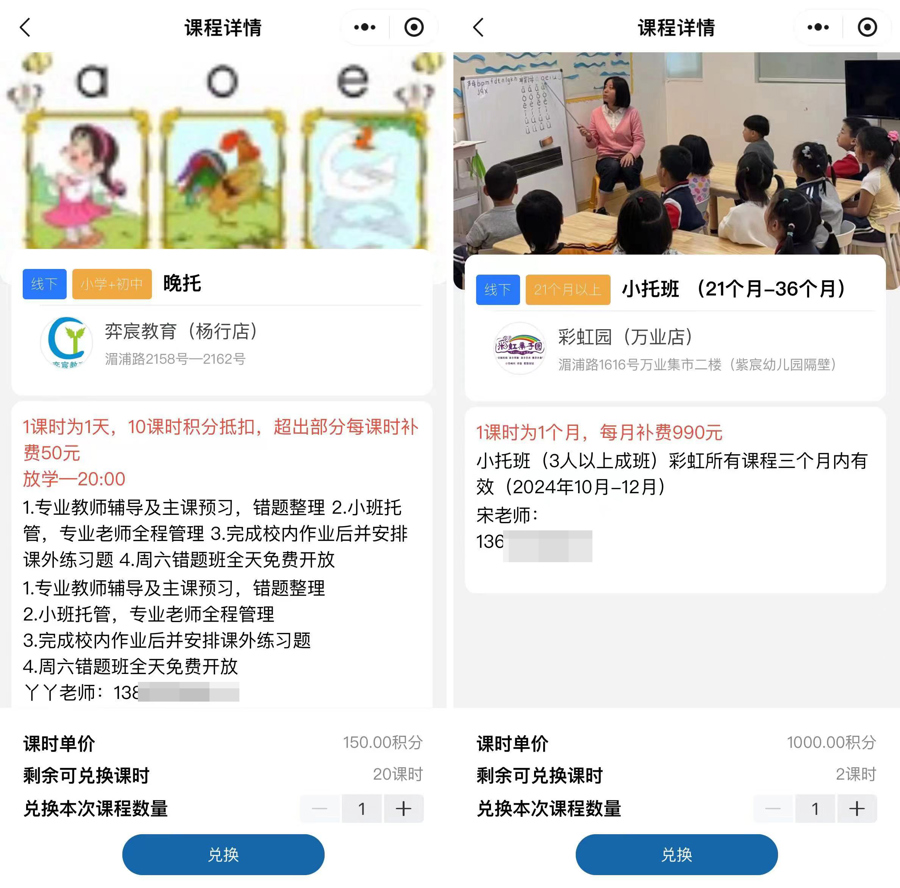 记者随后在“转课安心”平台上的多家培训机构中,使用了一些免费课时“引流”的说法,得到了验证。但是事实上,像育苗围棋这样的30个课时可以“引流”的机构并不多。大多数机构提供的免费课时很少,或者采用积分加上“补费”的方式。爱思宝贝杨行校区关闭后,陆先生在“转课安心”平台上获得8000分。经过比选,平台上附近的“陈华教育(杨兴店)”和“彩虹园(万业店)”提供的“幼儿园”课程符合他的要求。但陈华教育(杨兴店)只上架了20天的幼儿园服务,其中陆先生每天需要在最后10天补50元;虽然彩虹园(万业店)可以提供2个月的幼儿园服务,可以用积分扣除,但陆先生每个月除了消耗积分外还要支付990元。