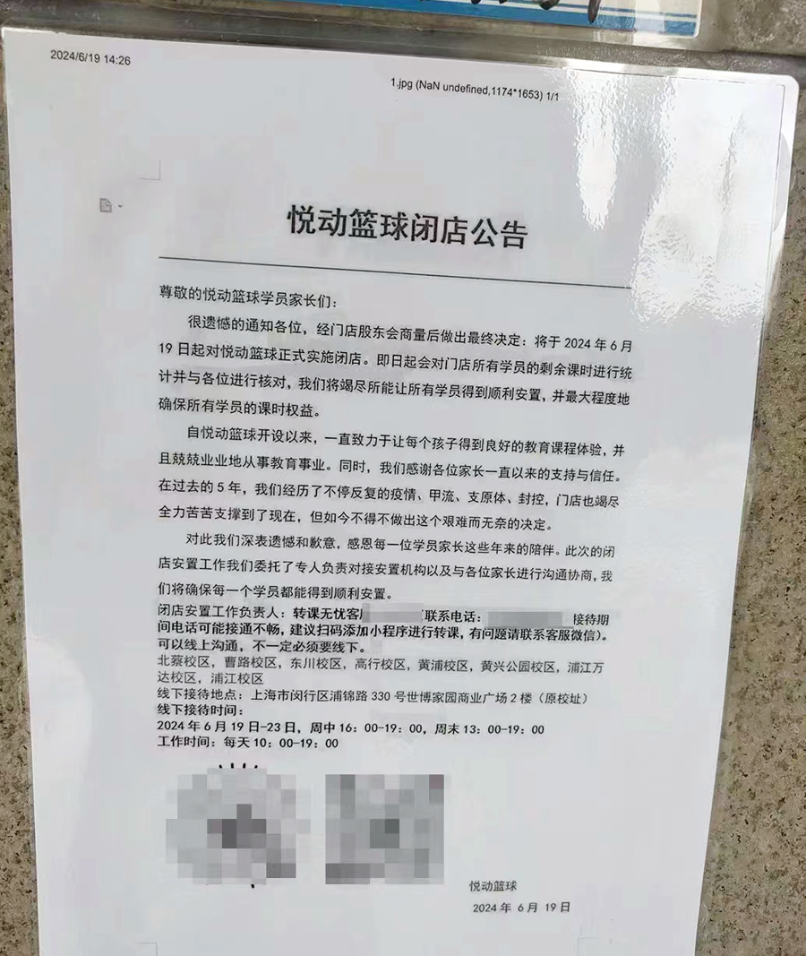 今年6月19日,教育培训机构“悦动篮球”关闭公告。