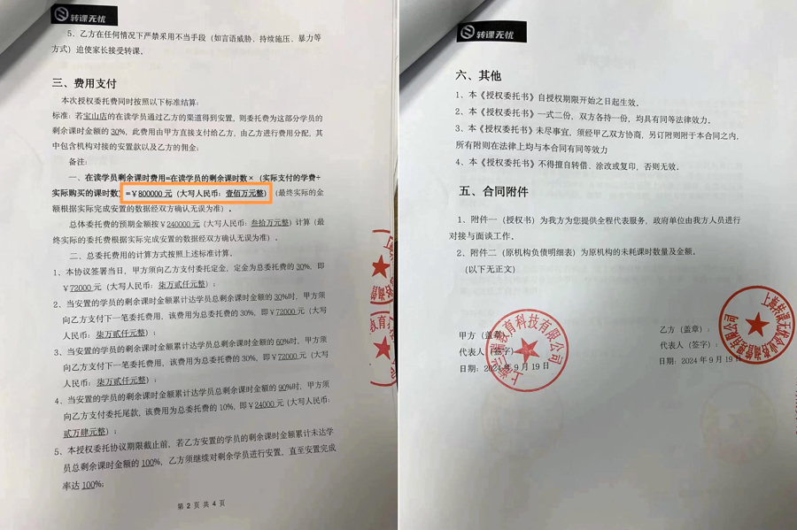 记者分别致电“转课安心”20号和9号客服,在电话中,他们声称平台具有“公益”特征。20号客服在电话里更有信心地说,“转课安心”帮机构经营闭店安置不收费。真的是这样吗?记者拿到了“上海兰瑞教育科技有限公司”与“安心转学”签订的“合作协议”,是扬琴儒墨的运营主体。在合同中,双方同意对扬琴儒墨的学员进行安置,而这种安置绝对不是“公益”。合同中约定了“委托费”,其余30%的学时安置完成,包括机构对接的安置费和“安心转学”的佣金。根据合同计算,扬琴儒墨的剩余教学费用为80万元,即委托费的预期金额为24万元…