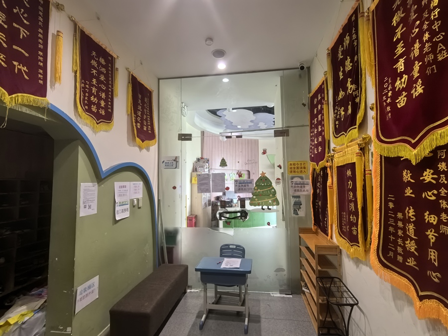 上海市宝山区松兰路807号2楼爱思宝贝早教机构杨行校区。一扇带有横幅的通道终点,校园玻璃门被环形锁锁。