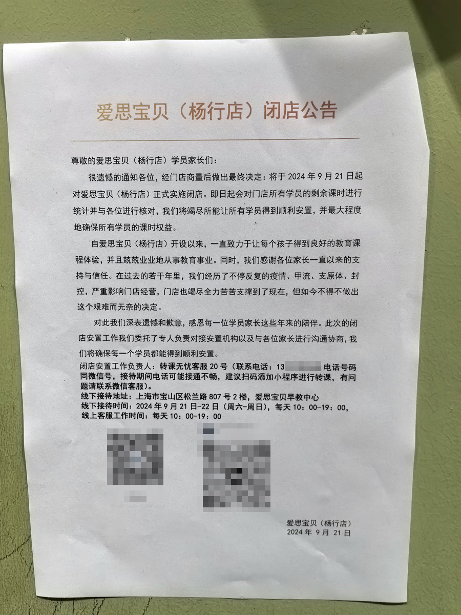 10月9日,记者在宝山区松兰路807号2楼爱思宝贝早教机构杨行校区看到,一扇校园玻璃门被环形锁锁上,上面挂满了横幅。9月26日物业催收函贴在门上,显示培训机构运营商“上海李祥文化传播有限公司”从8月份开始拖欠水电费。但是在一面墙上,贴着“爱思宝贝(杨行店)闭店公告”,签名日期是9月21日。在公告中,培训机构表示,受各种因素影响,“艰难而无奈”地实施闭店。下面,话锋一转,说是有专人操作关店安置工作。专人名为“转课安心客服20号”,后面留有手机号、二维码等联系方式。