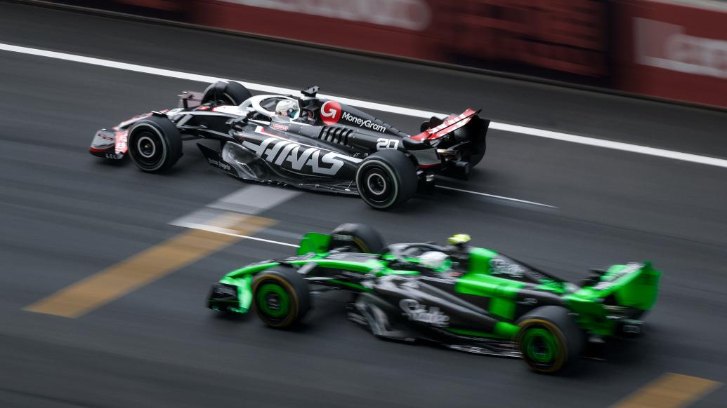 中国车手周冠宇于2024年4月21日在F1中国挑战赛上海站超越哈斯车队车手。