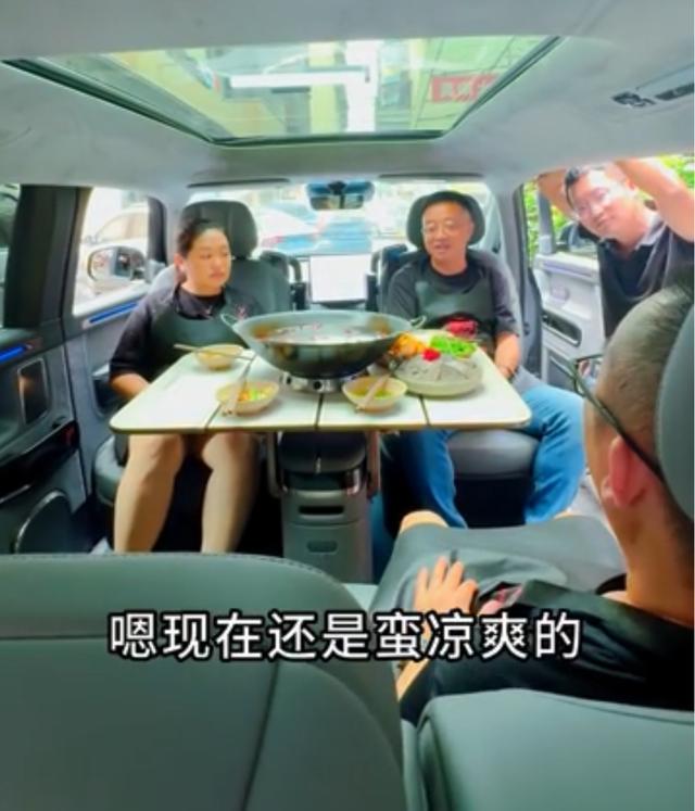 录像显示,杨大成一行人1800°转动前排座椅,与后排零距离,一个锅底、一盘毛肚、一份酥肉、一盘青菜和四个蘸料盘仍然放在可扩展的桌板上。杨大成还强调车内空调效果好,感觉很爽。他还说他可以在车里打麻将。