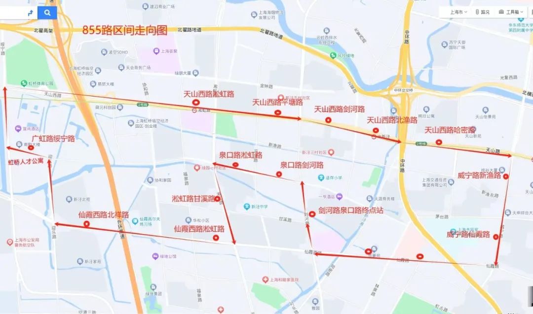 855路区间公交线路主要在新泾镇辖区内运行。从剑河路泉口路出发,沿途经过泉口路、淞虹路、仙霞西路、迎乐路、广虹路、绥宁路、天山西路、威宁路,最后回到剑河路,形成一条11公里左右的区间环线。