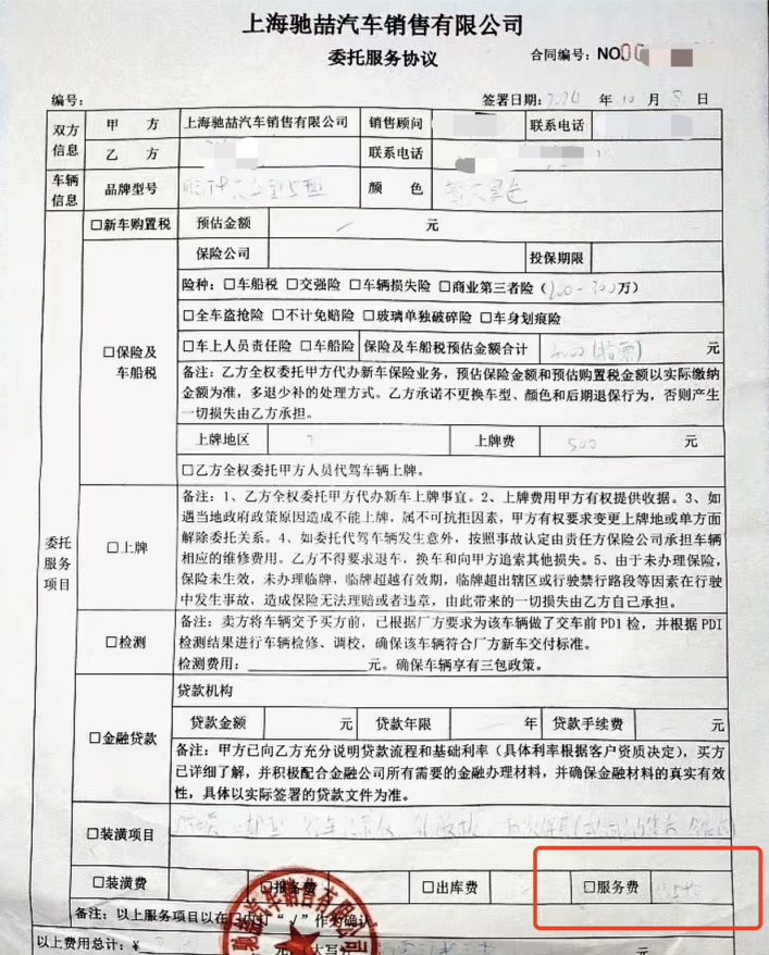 然而,10月9日到家后,张先生戴着老花镜仔细检查了服务合同,却发现其中标有“服务费”,高达15590元。他说:“我马上打电话给销售人员,她说这项服务费是收取汽车指导价的10%,协议已签订,如果不同意,押金也不能退还。“张先生说,如果加上这笔费用、保险费和许可费,这辆车的落地价超过了15万元,这已经远远超过了他之前在其他商店的咨询价格。他说:“如果对方当时明确告诉我有服务费,我就不能在这家商店买车。”