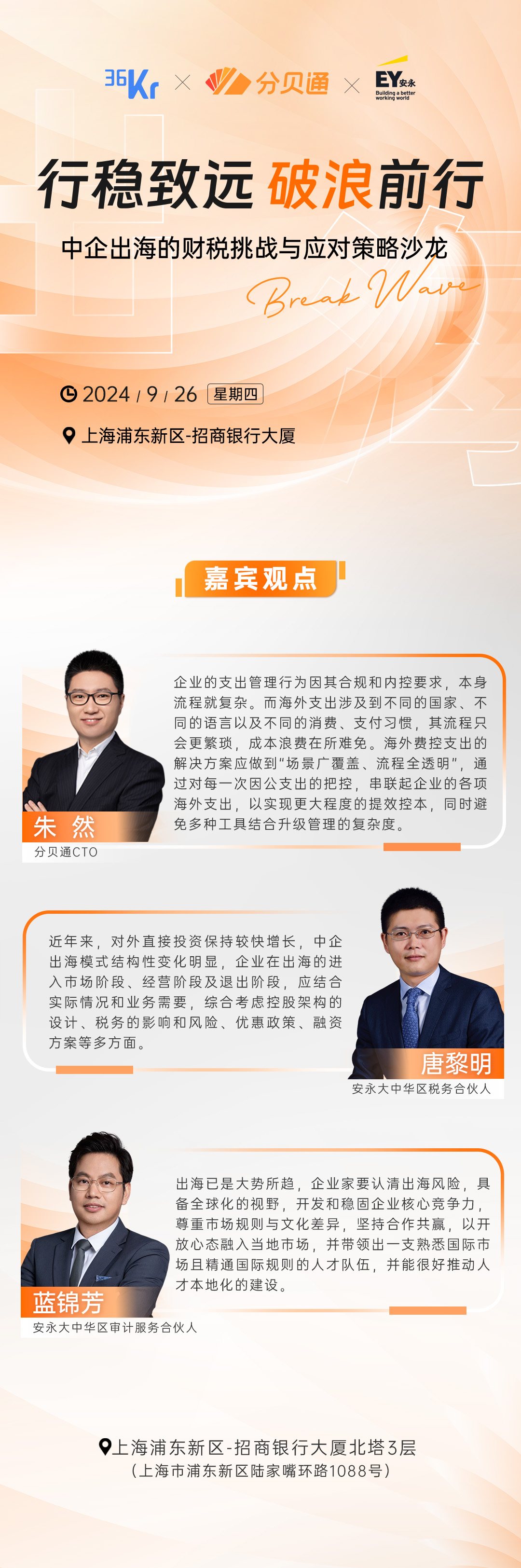 在你踏上旅程之前,你需要努力工作。随着越来越多的高质量沟通和前沿观察为中国出海企业填补了信息差,出海的考验正在慢慢被拆解成机会。9月26日,“中企出海财税挑战与应对措施”沙龙在上海招商银行大厦成功举办。分贝通和36Kr携手搭建桥梁,帮助创业公司成长,带出中国市场的高潜力运营模式,扬帆出海。