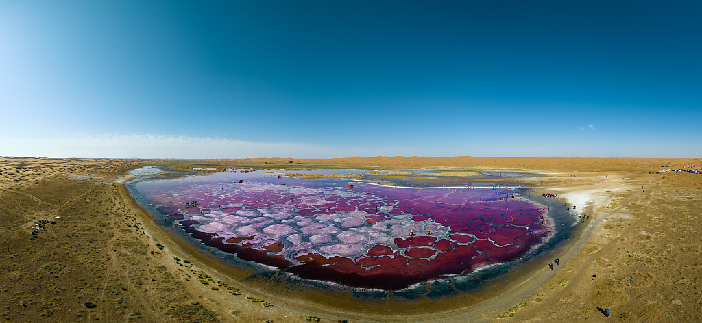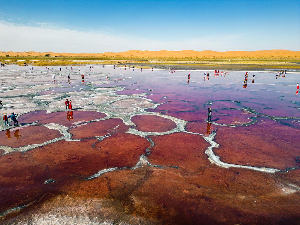 内蒙古阿拉善,腾格里沙漠湖泊,2023年10月13日,站在乌兰湖“地球心脏”上的游客星罗棋布。