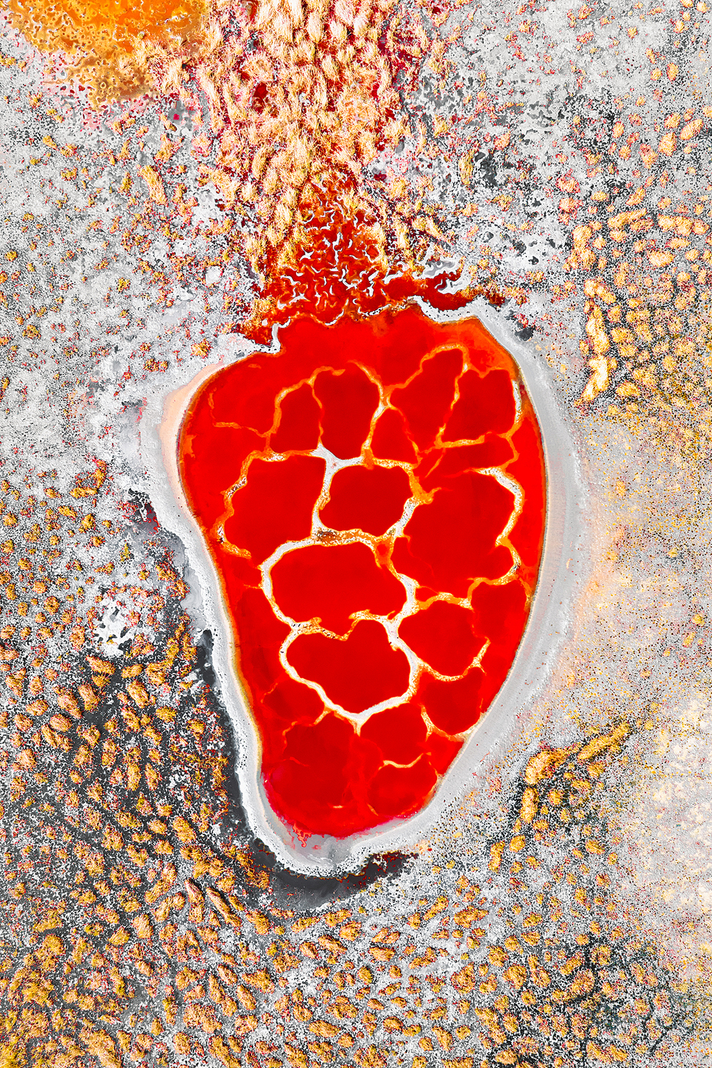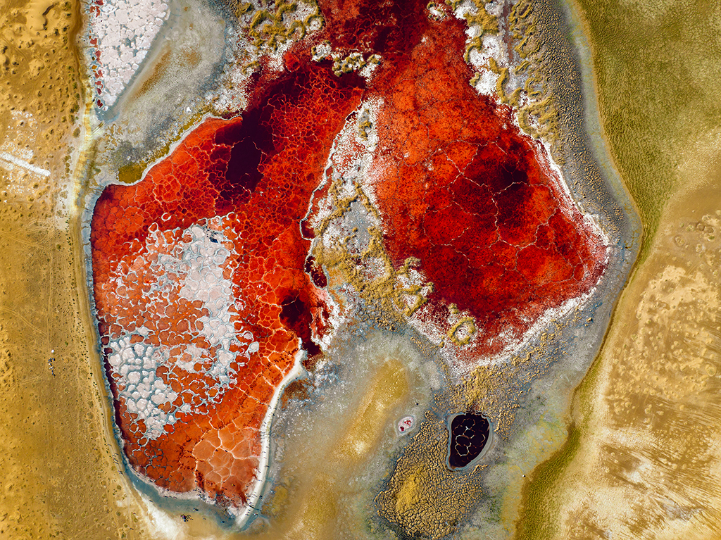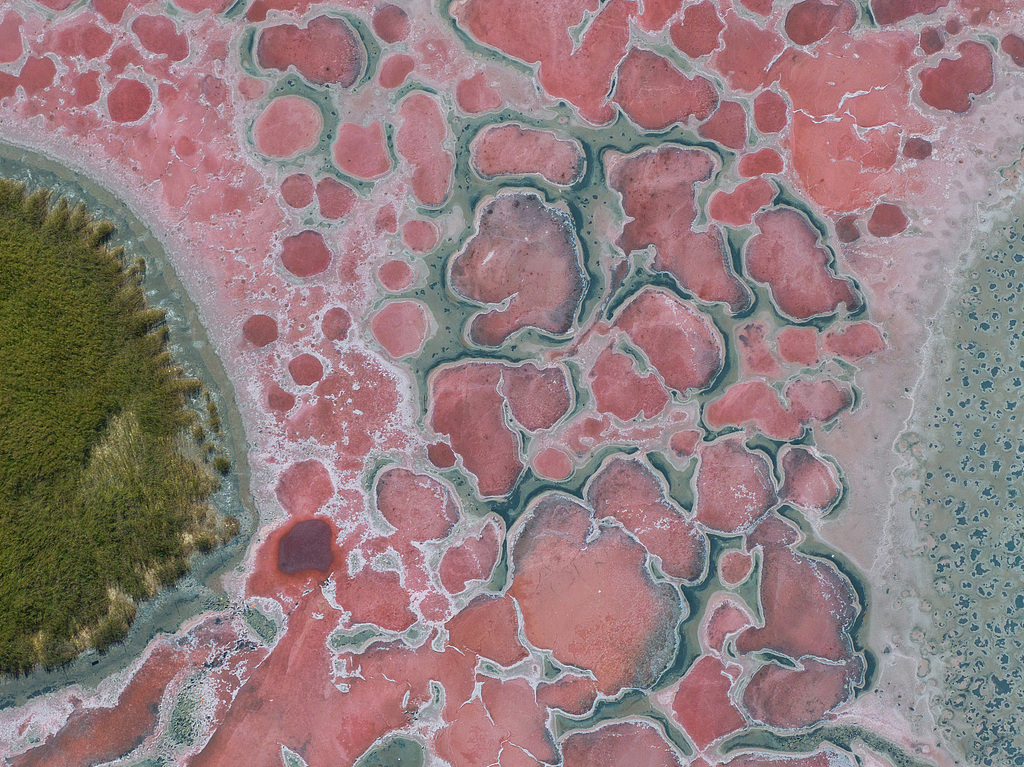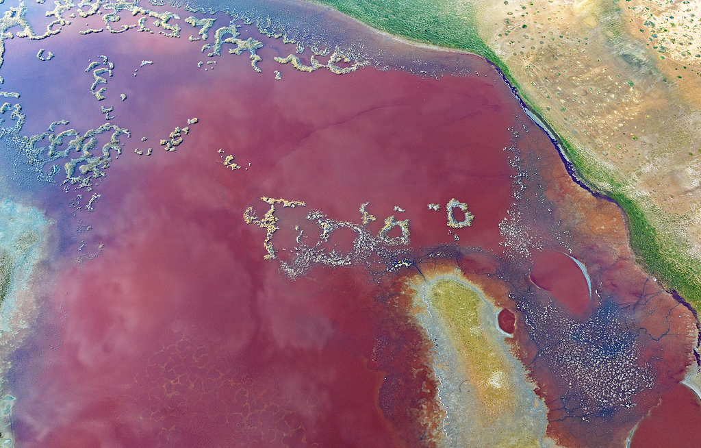 湖面上分布着看起来像“血管”的盐碱纹理。