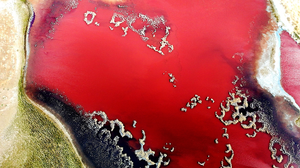 由于蒸发的原因,红湖周围的盐分被渗出,一圈圈白色的盐碱纹理像“血管”一样遍布湖泊周围。