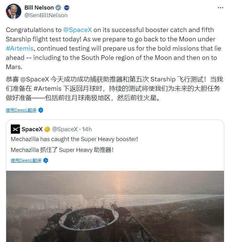 比尔·尼尔森,美国宇航局局长,在第一时间发布祝贺信息,并开始想象未来的月球和火星。