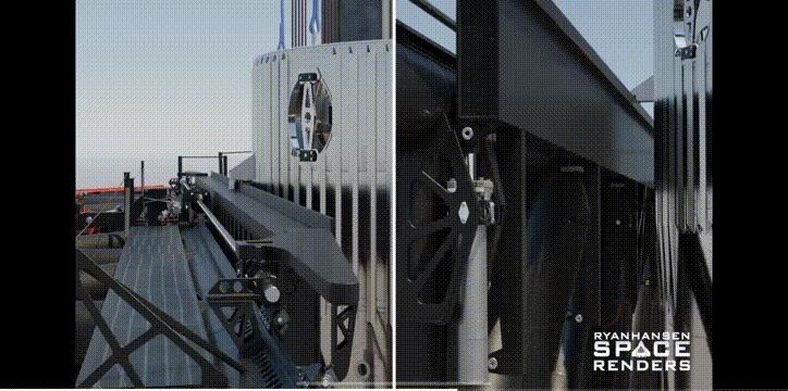 当推进器的三分之二落在机械臂下方时,它们会保持悬停状态,机械臂会靠近,推进器格子下的支撑点和两侧的辅助稳定插座会“抓住”并固定推进器。最后,将推进器放在发射架上[2]。