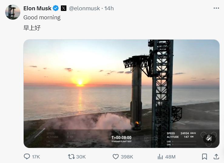 与每个人的兴奋相反,马斯克只是风轻云淡地发了一条信息:Good morning”。