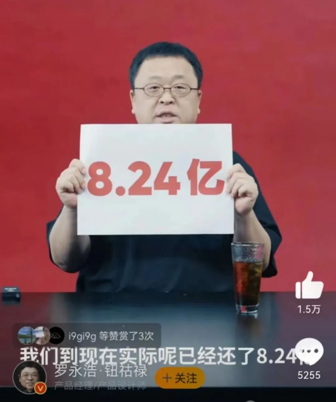 今年8月,罗永浩公布了他的还款流程,目前已经还款8.24亿元,其中直播电商税后收入达到5.48亿元,是最大的收入。