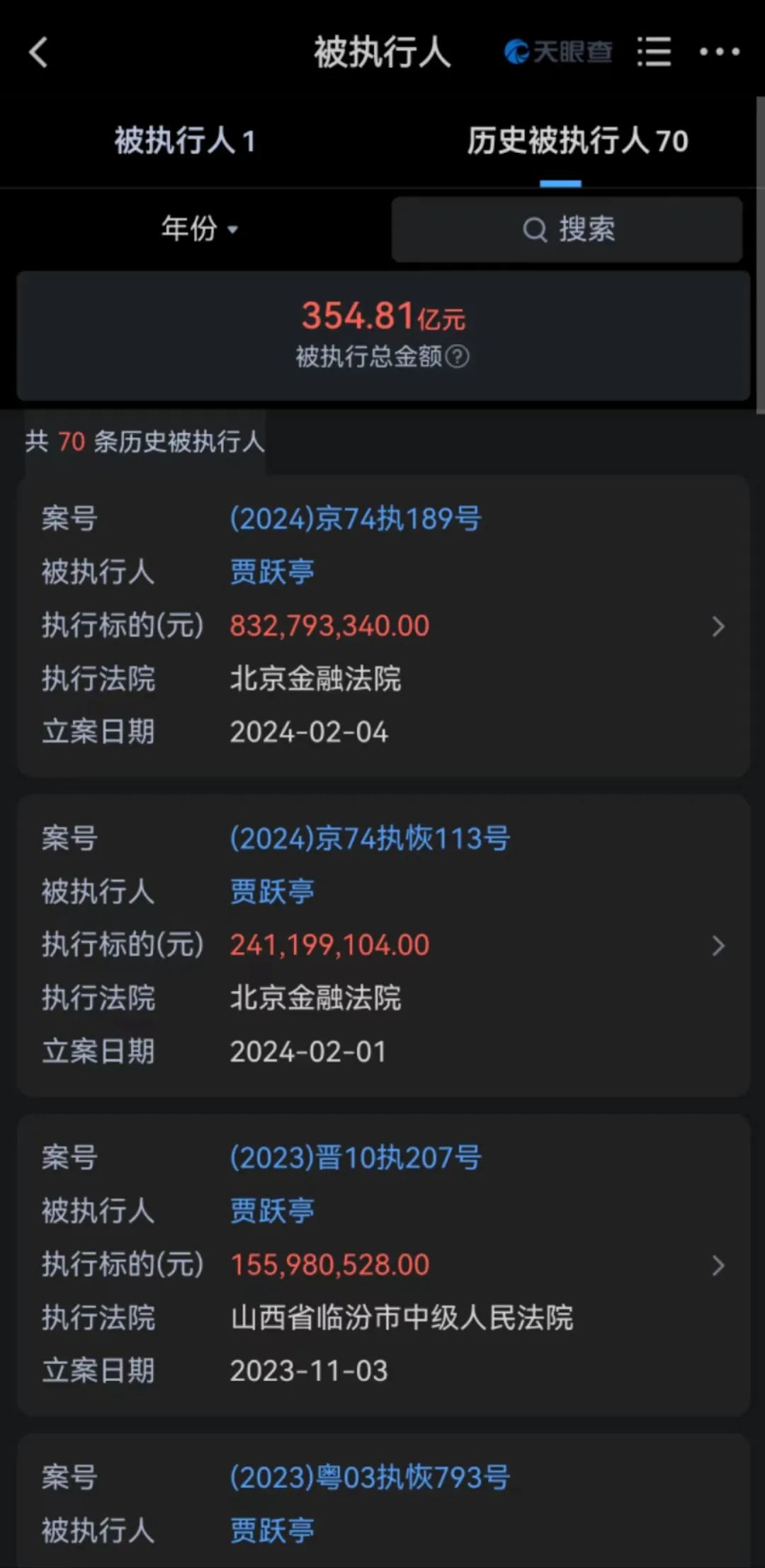 根据天眼查APP显示,截至目前,贾跃亭在中国被判定为被执行人的次数已达70次,涉及的被执行人总数已达354.81亿元。