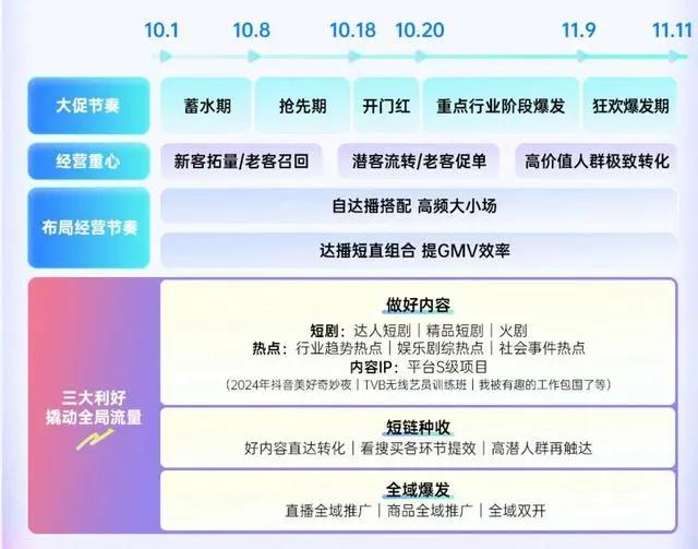 Aautorapper的双十一投资于9月19日开始,预售于10月10日开始。平台通过包括短视频、直播、商场在内的全球协同策略,提供200亿流量补贴,促进商家多渠道增长。特别是为家用电器、女装、亲子等行业提供详细的帮助。